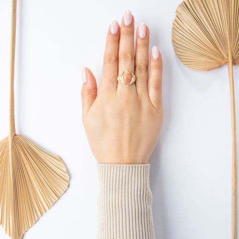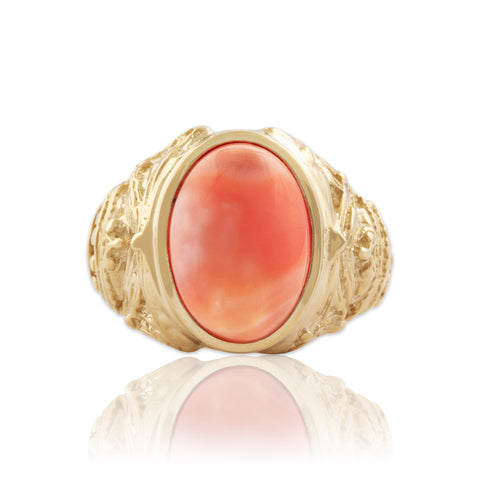 Vintage Large 14k Yellow Gold Coral Impressive Decorated Cabochon Ring 8.75