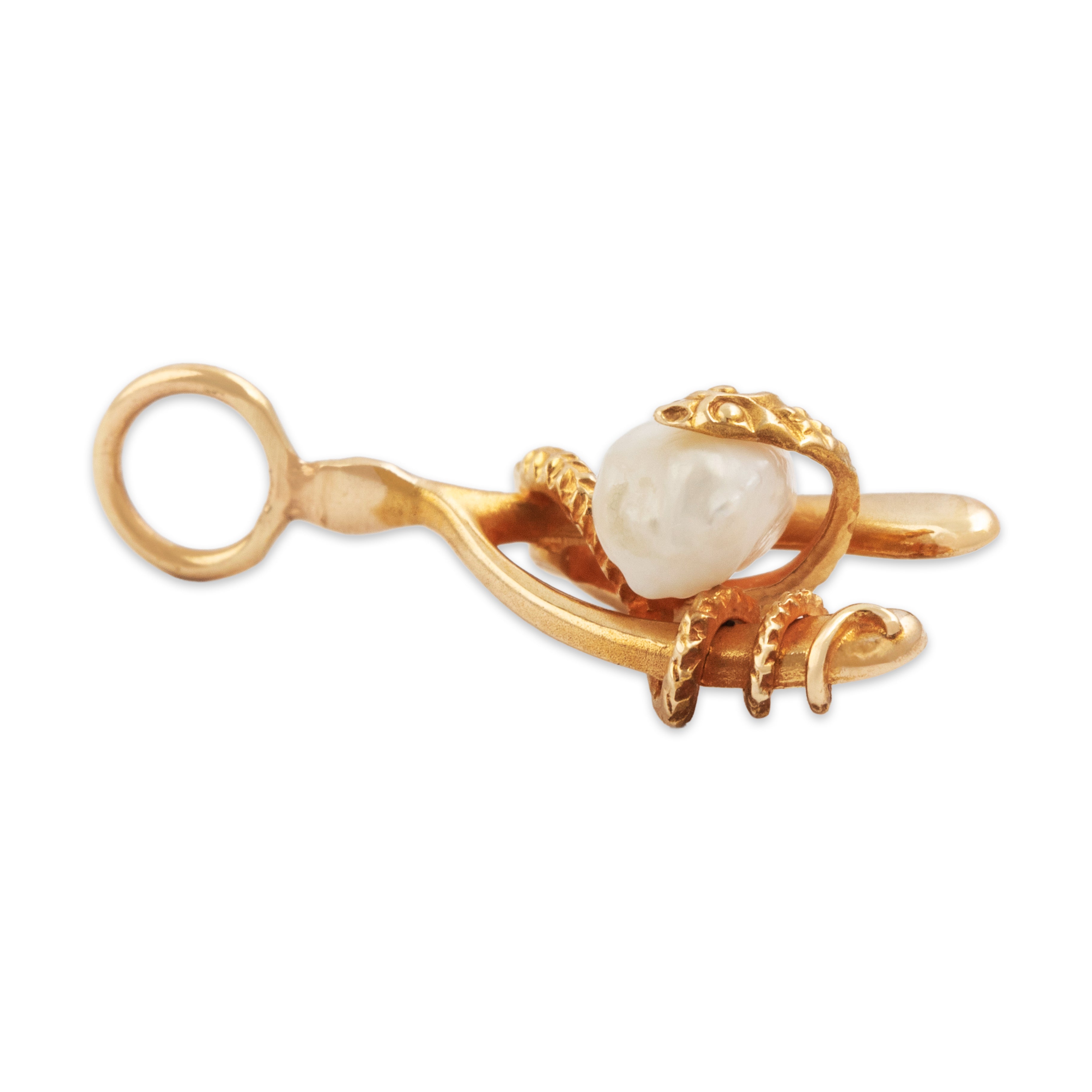 Discover this 14k yellow gold pendant crafted by an antique maker in a wonderful lucky wishbone and coiling serpent design featuring pearl. All gemstones are natural, earth-mined stones, unless stated otherwise.