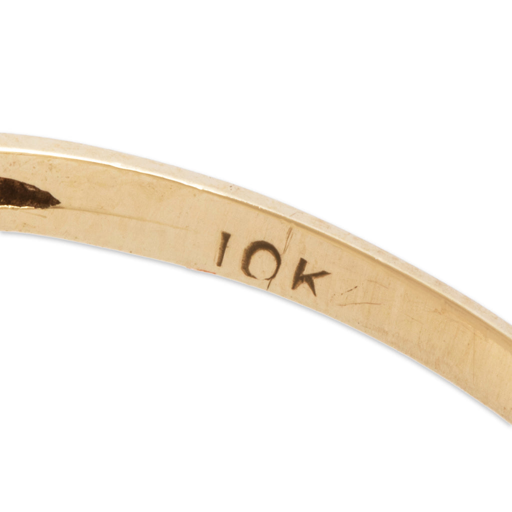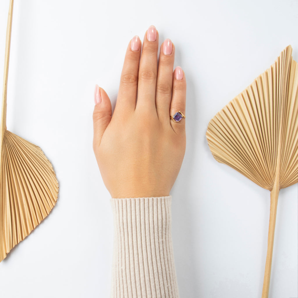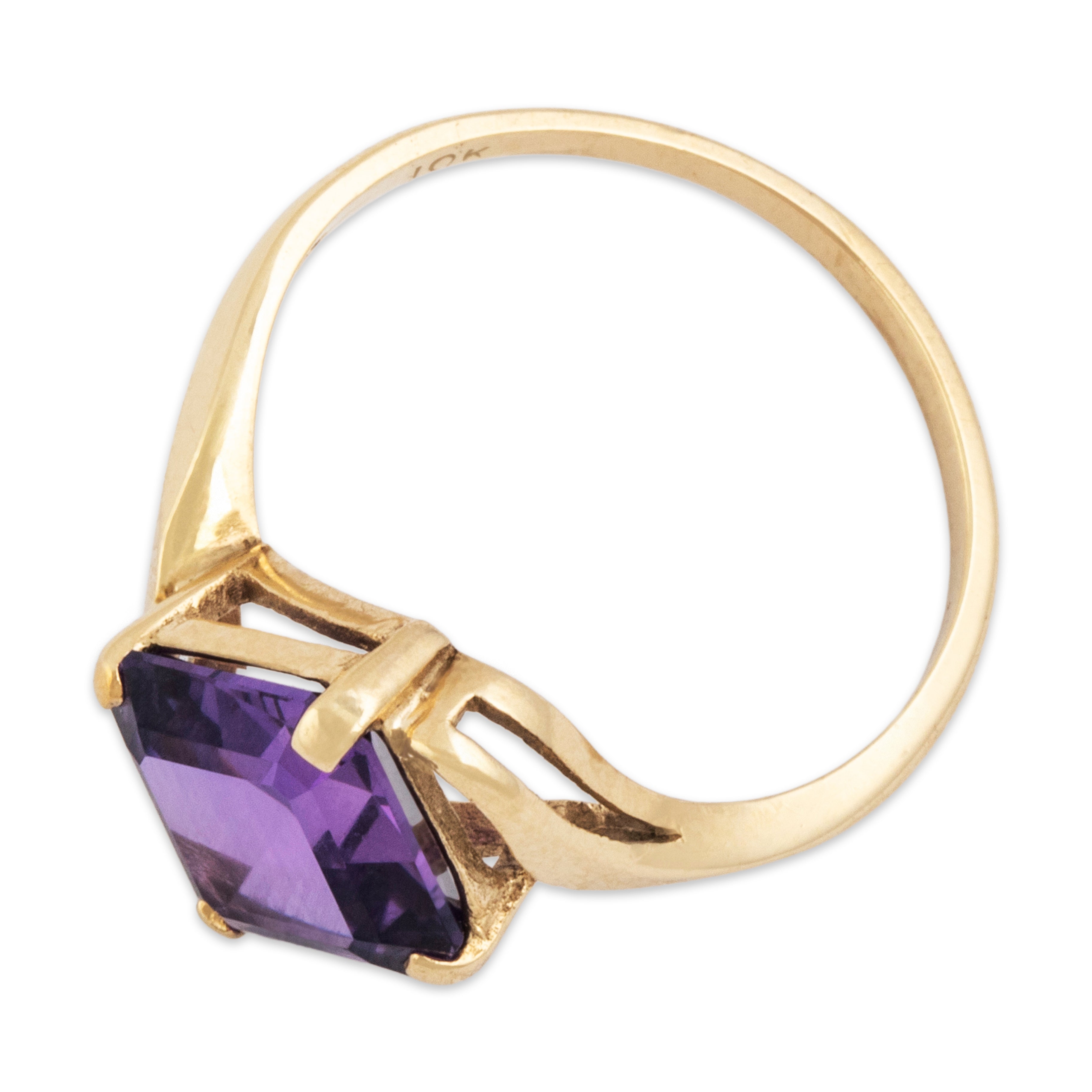Discover this 10k yellow gold ring crafted by a vintage maker in this wonderful flashing square bypass design featuring purple synthetic sapphire. All gemstones are natural, earth mined stones, unless stated otherwise.