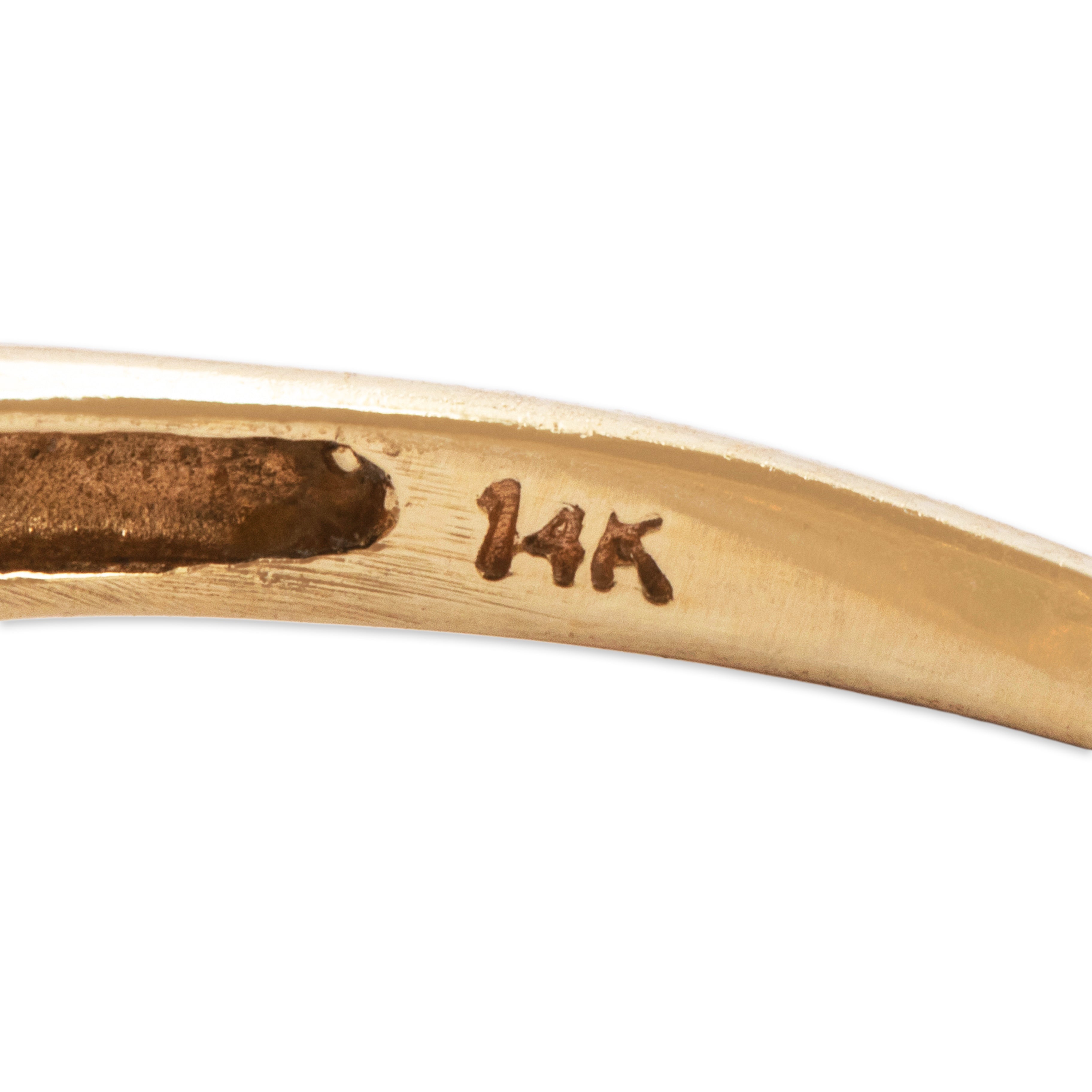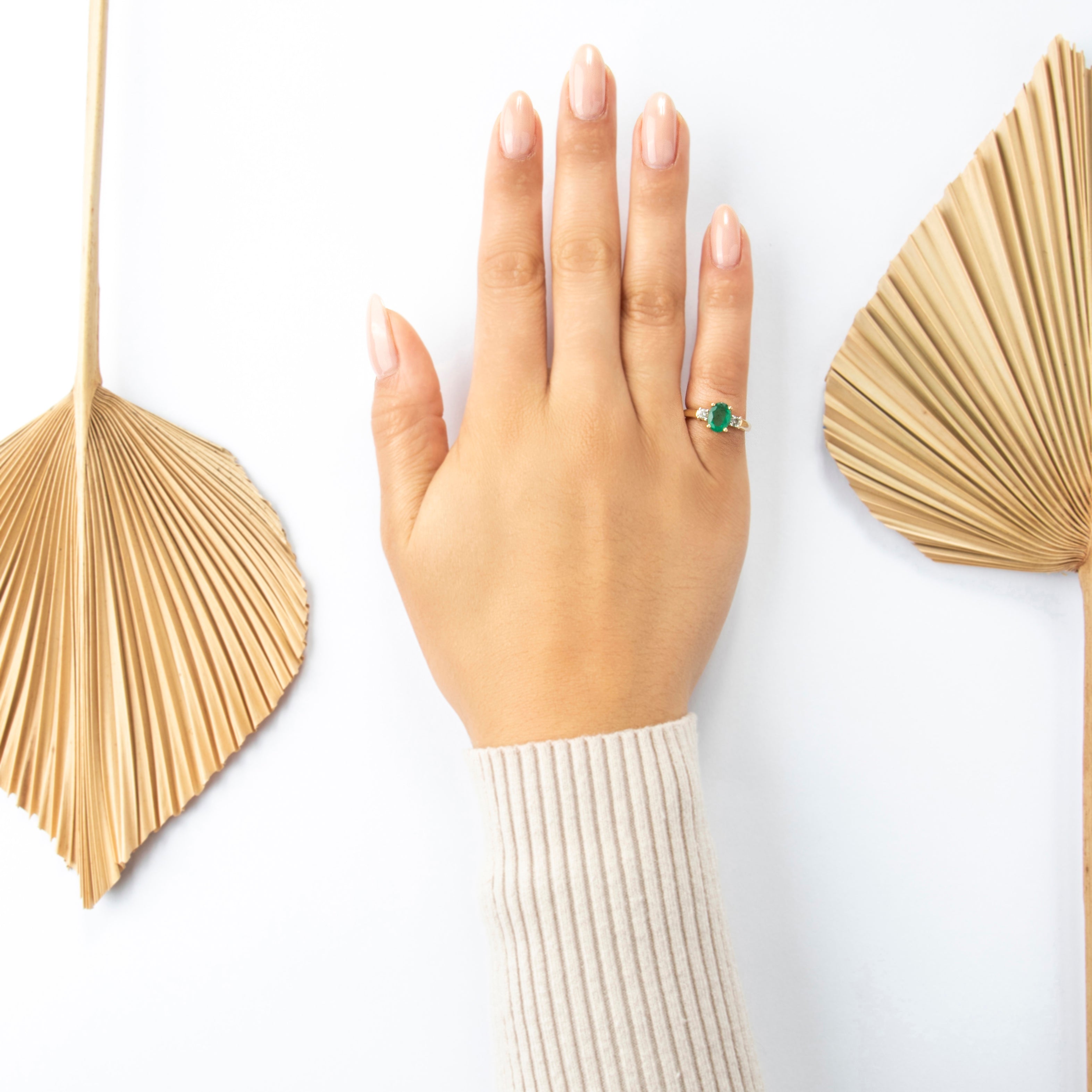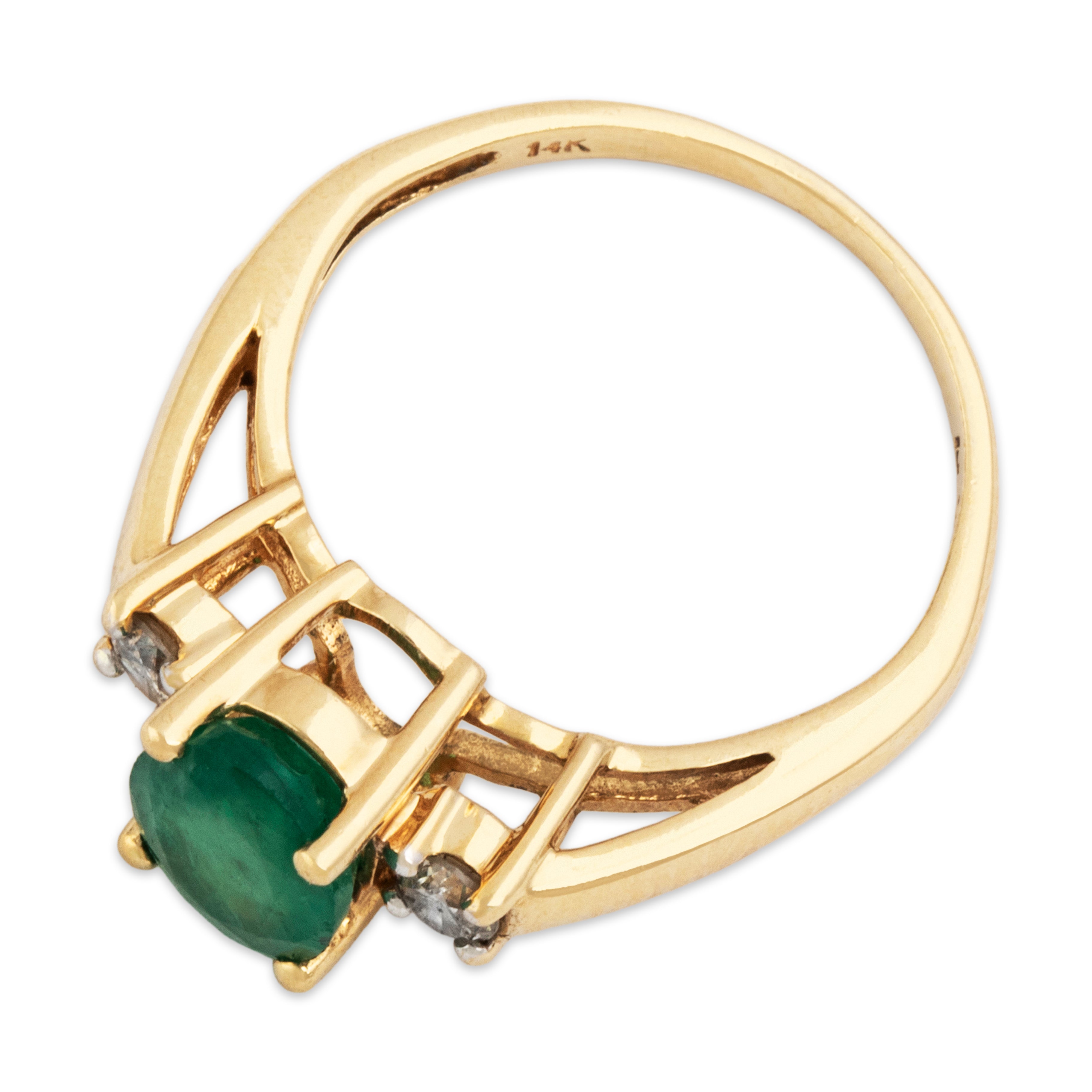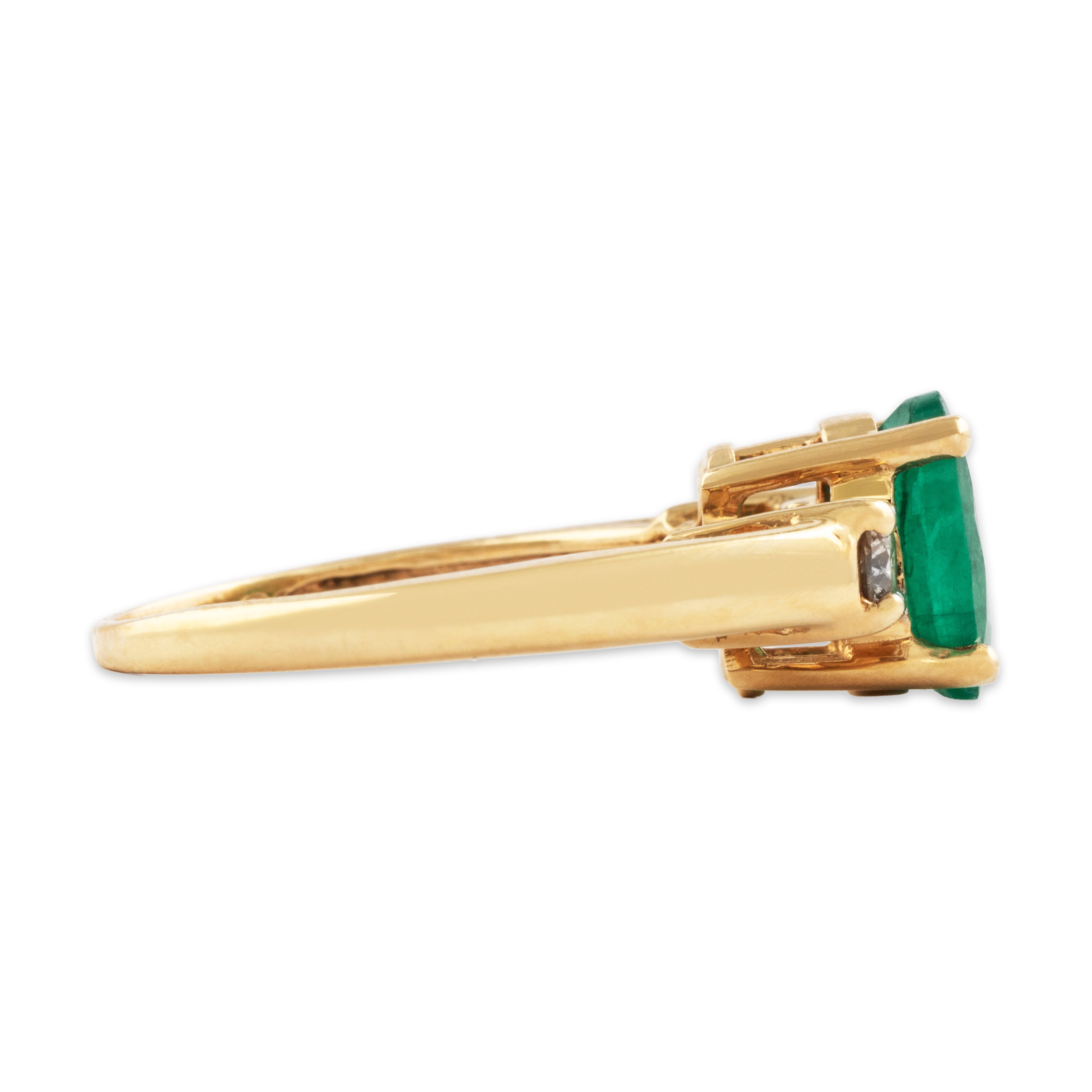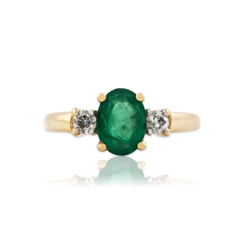 Discover this 14k yellow gold ring crafted by a vintage maker in a wonderful elegant three-stone design featuring emerald and diamond. All gemstones are natural, earth-mined stones, unless stated otherwise.