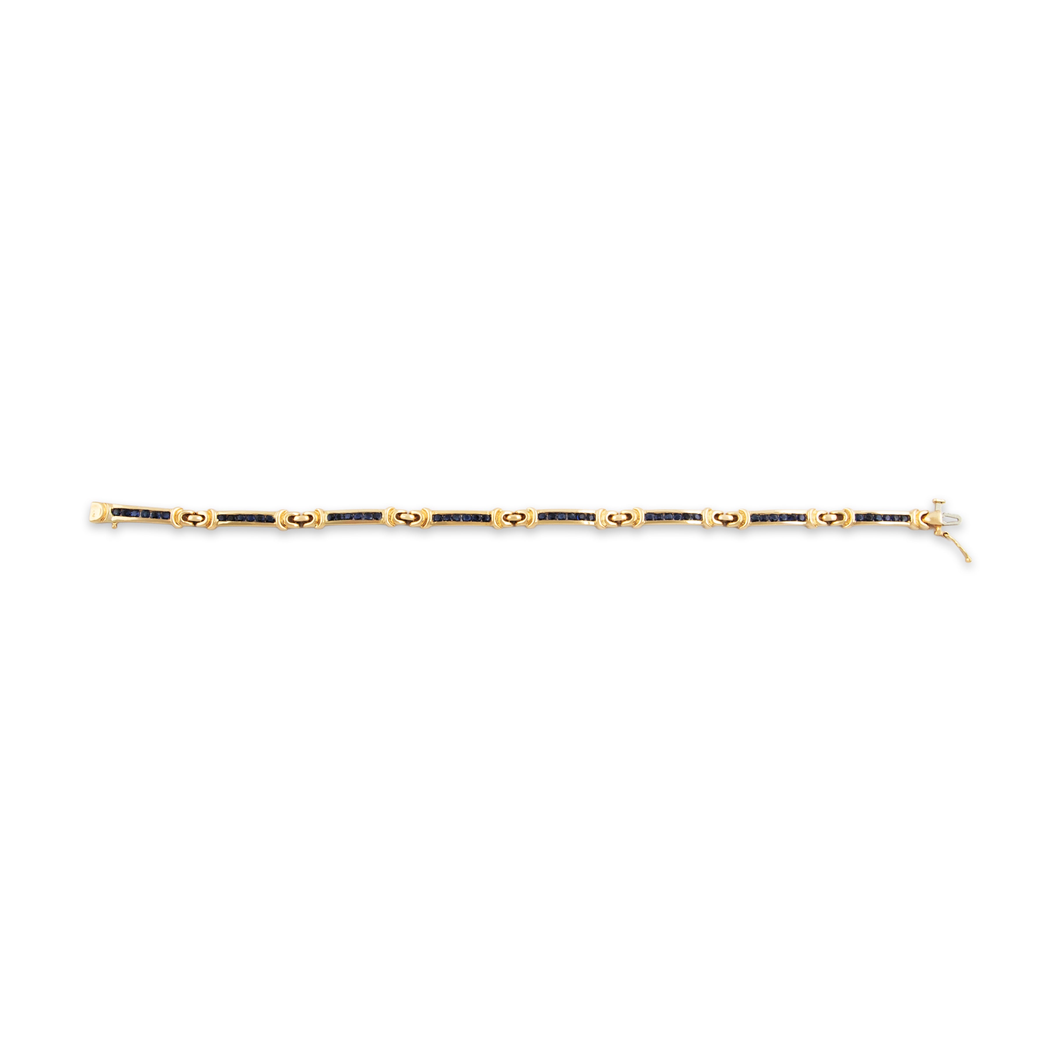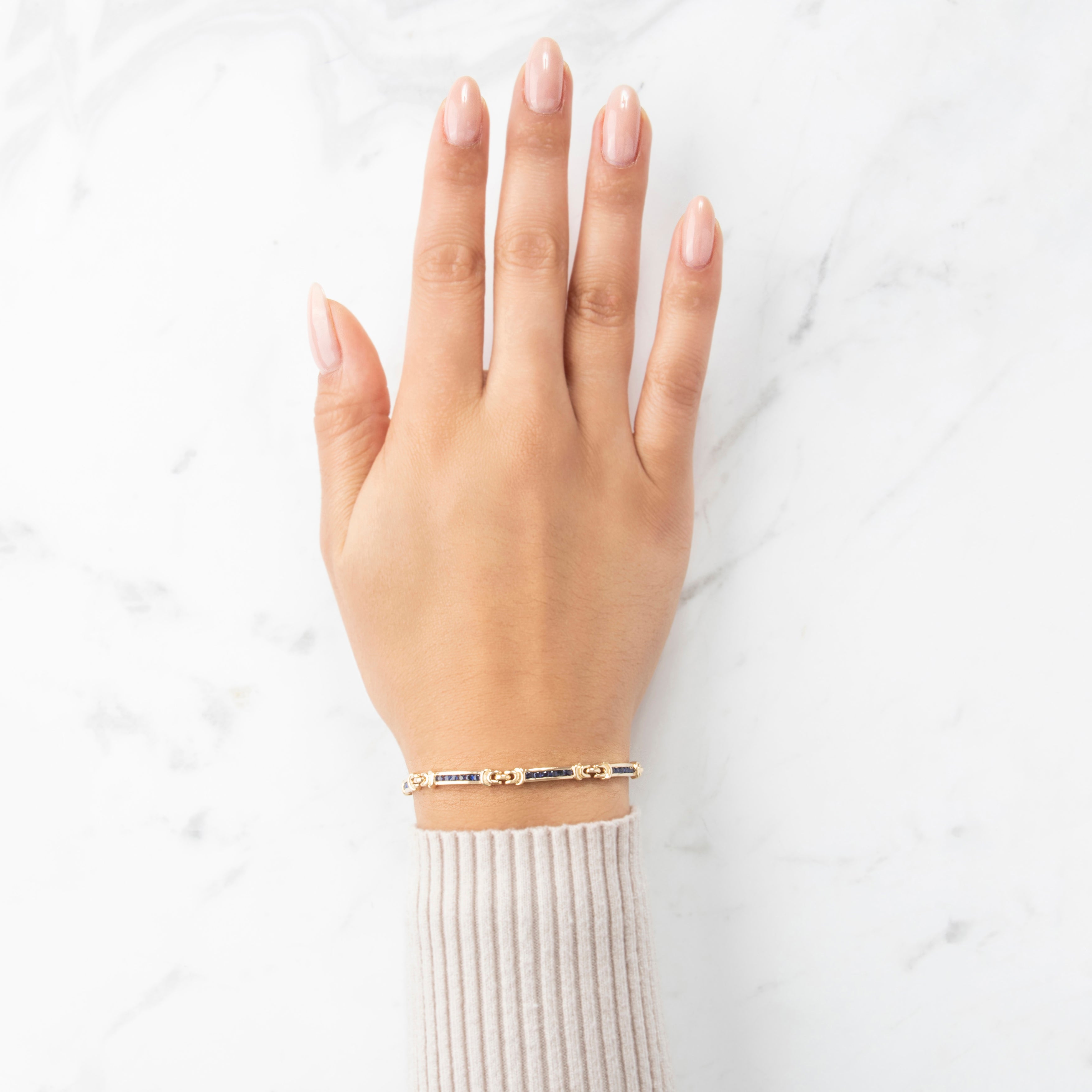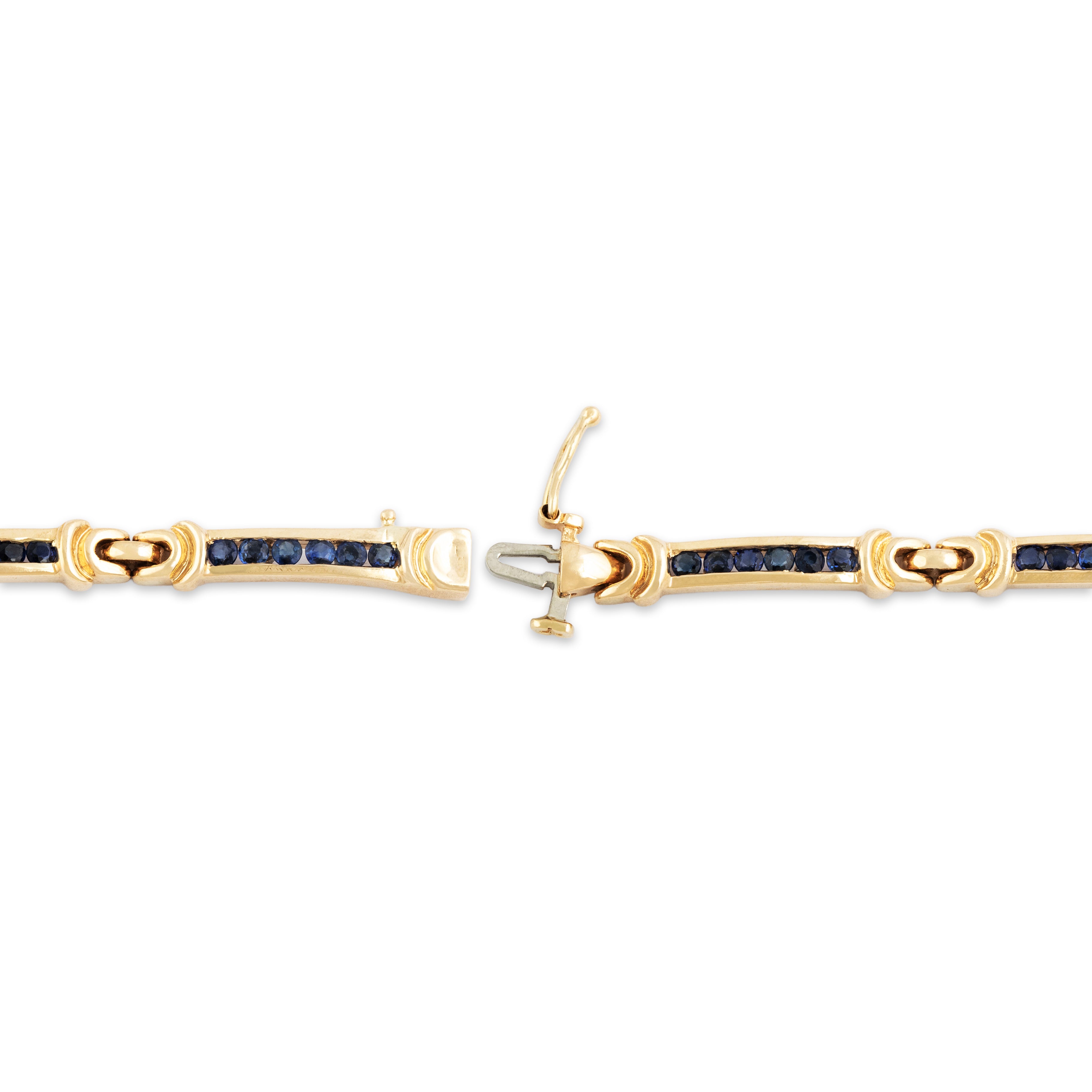 Discover this 14k yellow gold bracelet crafted by a vintage maker in a wonderful buckle link channel-set line design featuring blue sapphire. All gemstones are natural, earth-mined stones, unless stated otherwise.