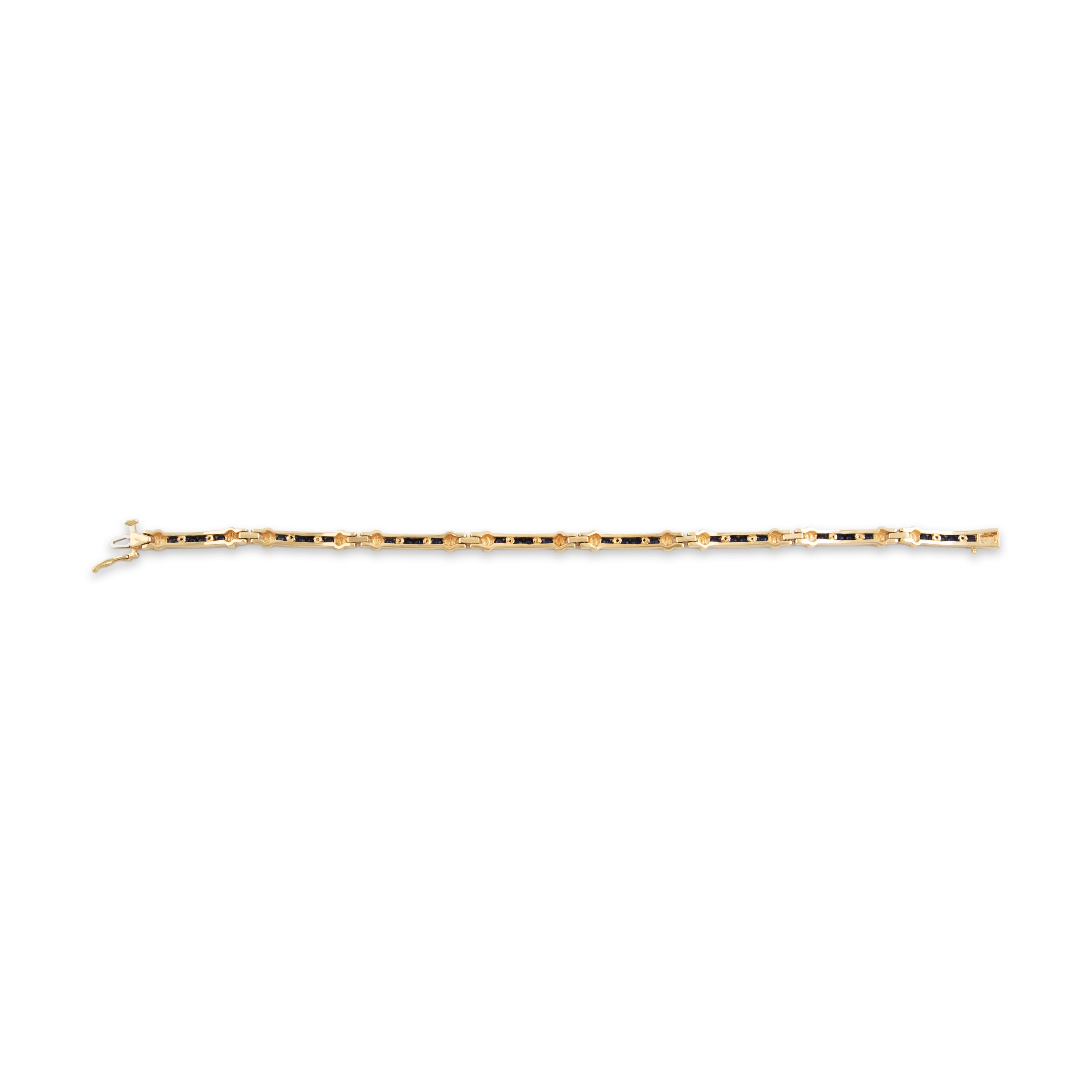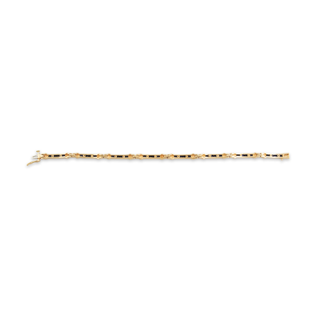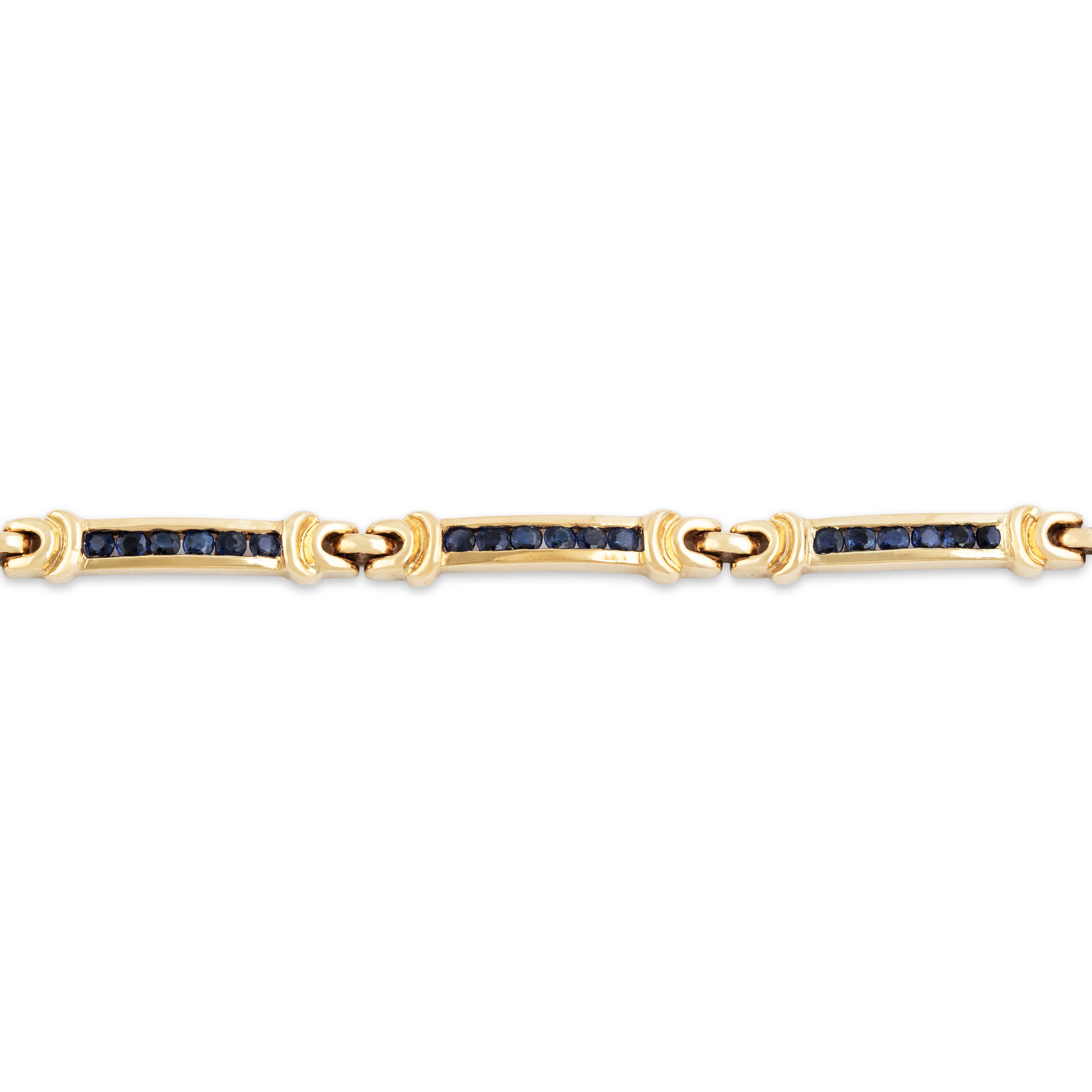 Discover this 14k yellow gold bracelet crafted by a vintage maker in a wonderful buckle link channel-set line design featuring blue sapphire. All gemstones are natural, earth-mined stones, unless stated otherwise.