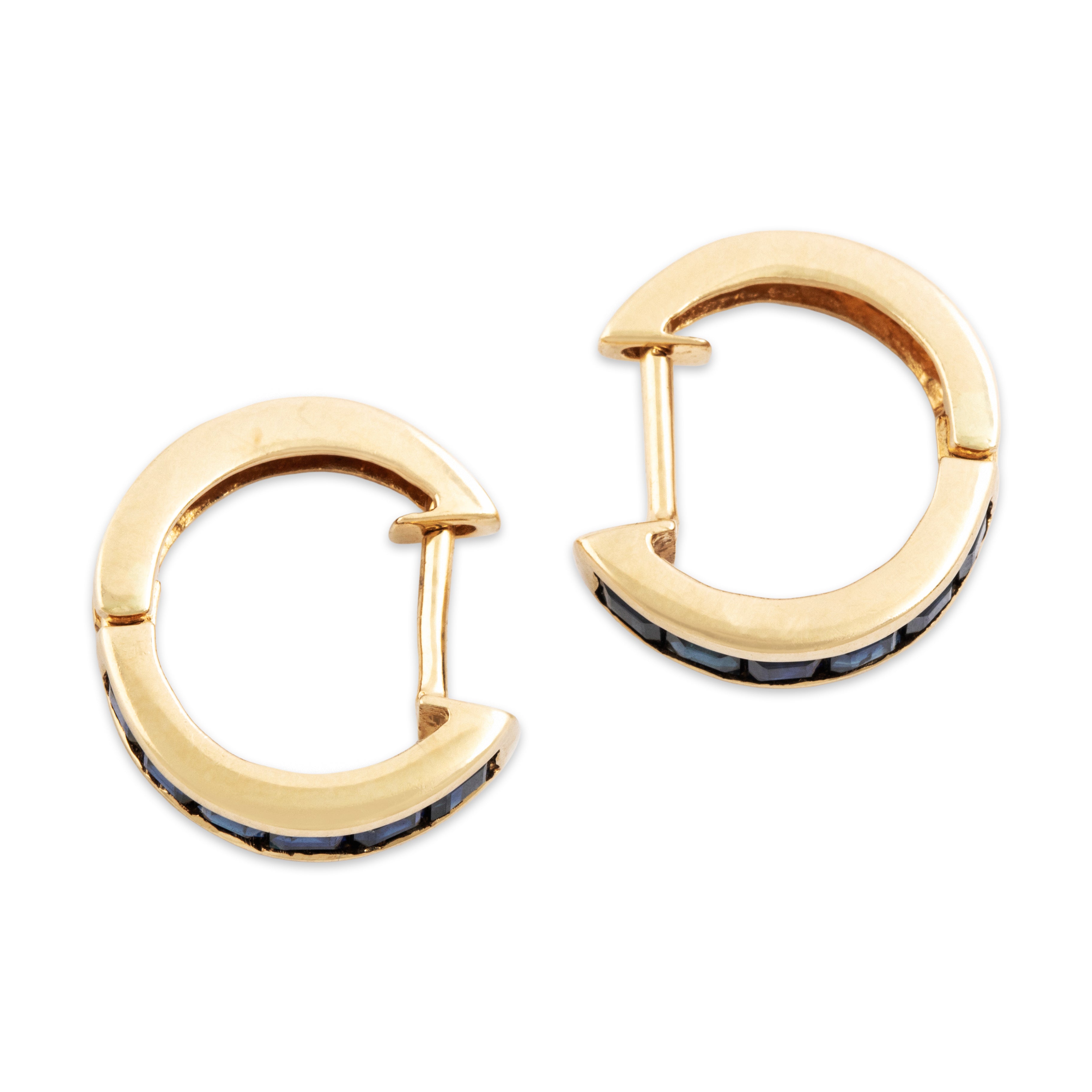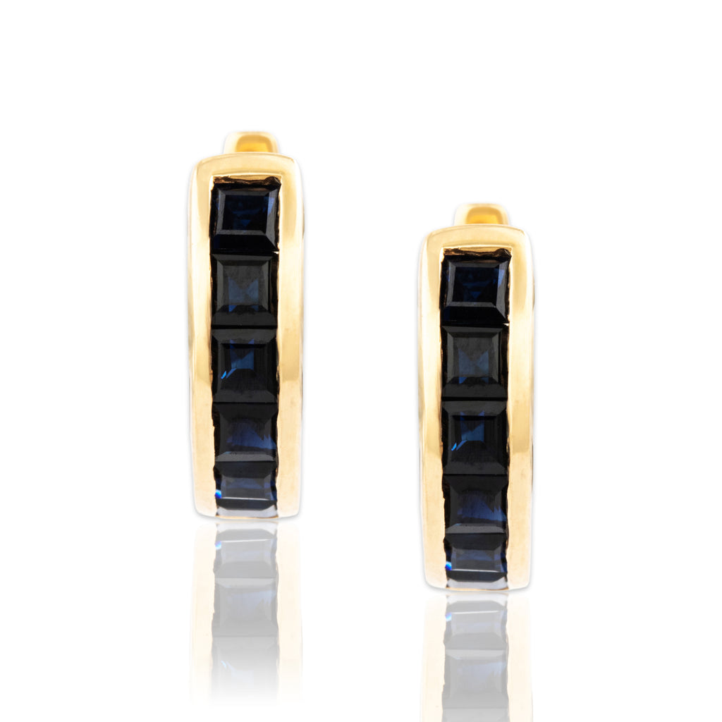 Discover a pair of 14k yellow gold huggie earrings crafted by a vintage maker in this wonderful classic channel set design featuring dark blue sapphire. All gemstones are natural, earth mined stones, unless stated otherwise.