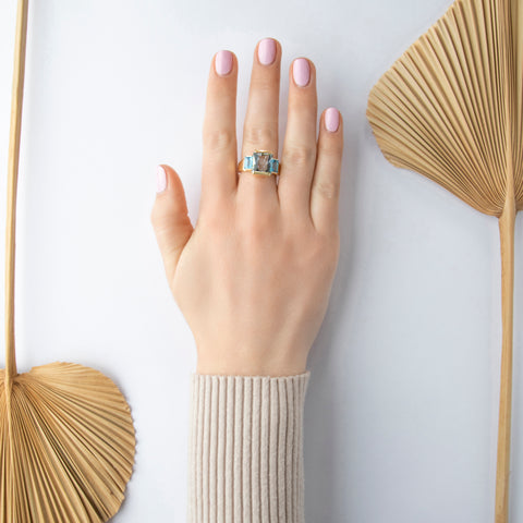 Vintage 10k Yellow Gold 4.3ct Aquamarine 2.3cttw Blue Topaz Azure Trio Ring 9.00