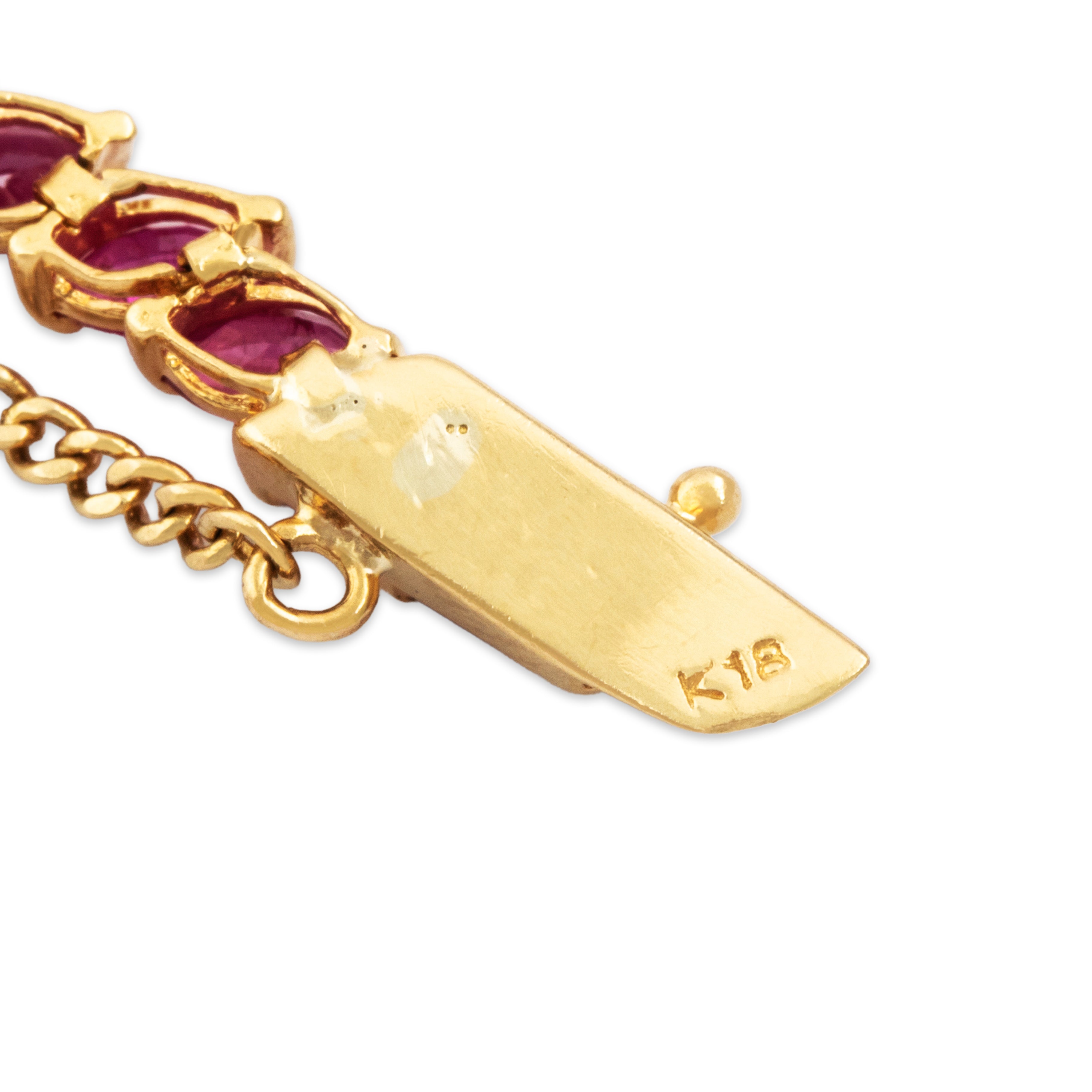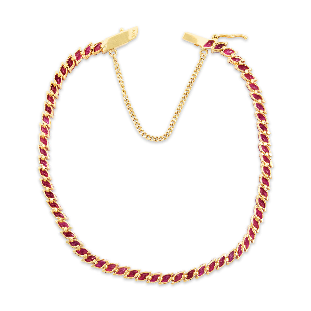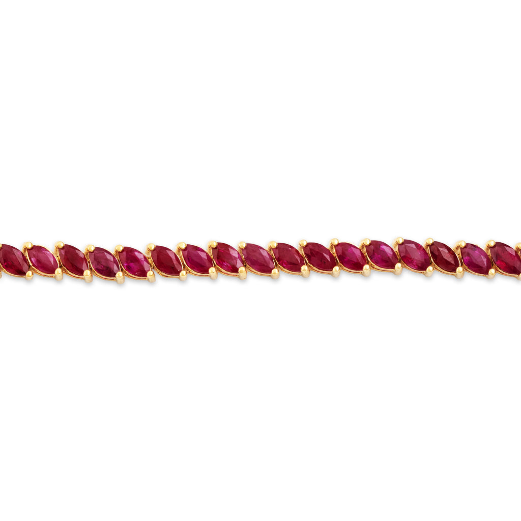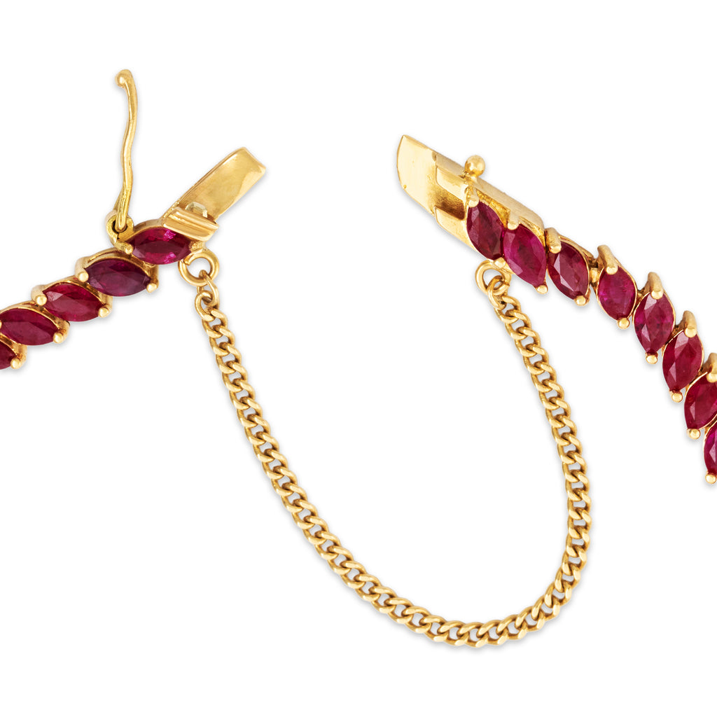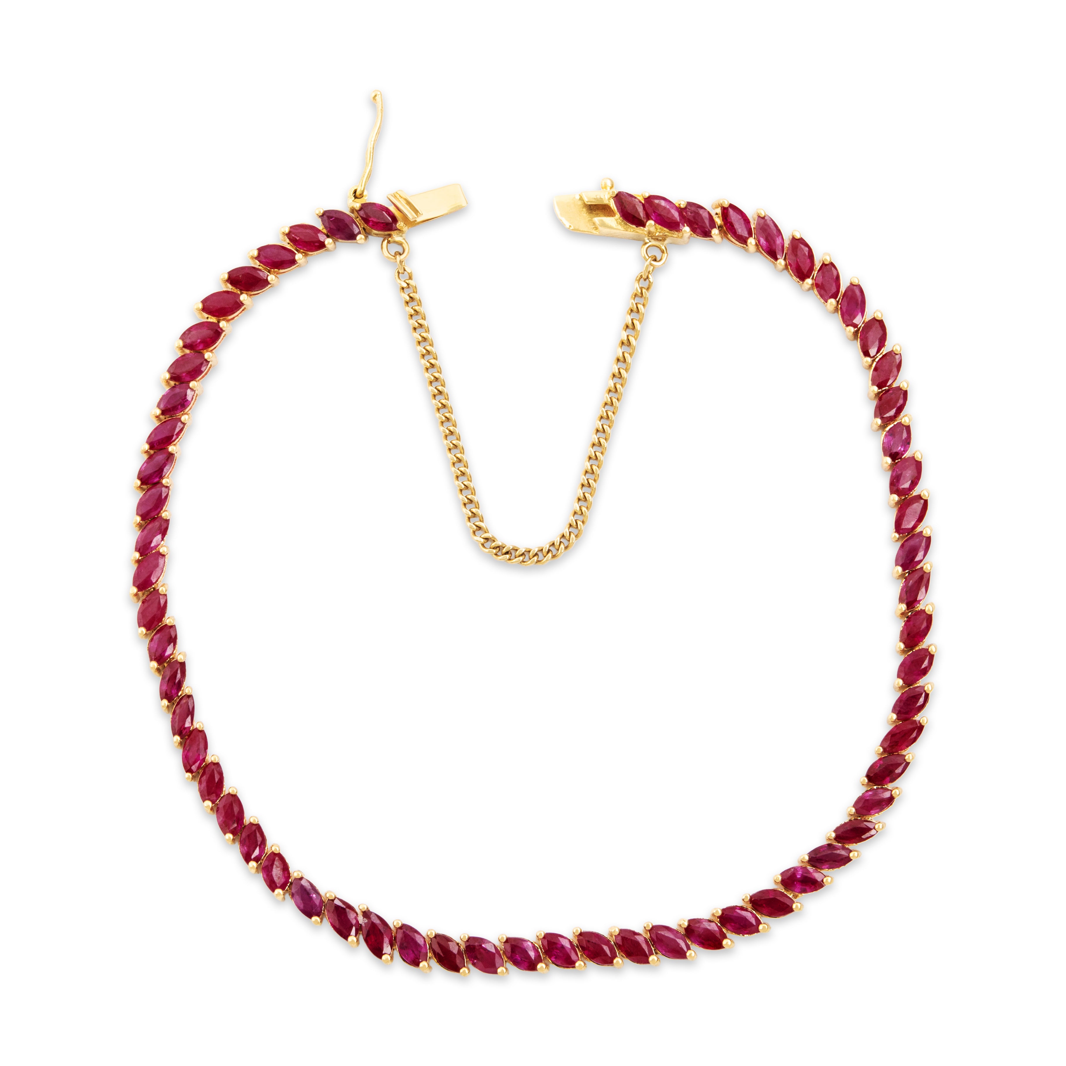 Discover this 18k yellow gold tennis bracelet crafted by a vintage maker in a lovely marquise cut design featuring ruby. All gemstones are natural, earth-mined stones, unless stated otherwise.